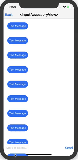 Here, the text input is actually part of the input accessory view itself. This is commonly used in messaging applications, where a message can be composed while scrolling through a thread of previous messages.